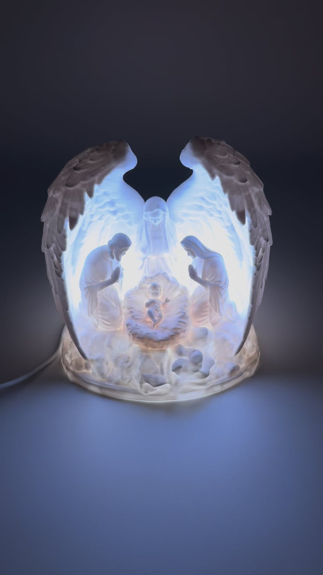 Breng warmte en magie in je interieur met deze prachtige verlichte kerststal, vervaardigd uit fijn porselein en subtiel omhuld door sierlijke engelenvleugels. De gedetailleerde figurenset – met Maria, Jozef en het kindje Jezus – wordt van achteren zacht aangelicht door LED-verlichting, waardoor een sfeervol en rustgevend schouwspel ontstaat.